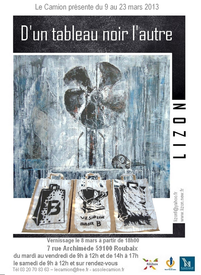 Exposition Lizon jeudi 16 janvier 2025 , par Maxime Du 8 mars à 18h00 au 23 mars 2013 à 18h00 Le camion 7 rue Archimède Roubaix, 59100