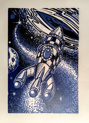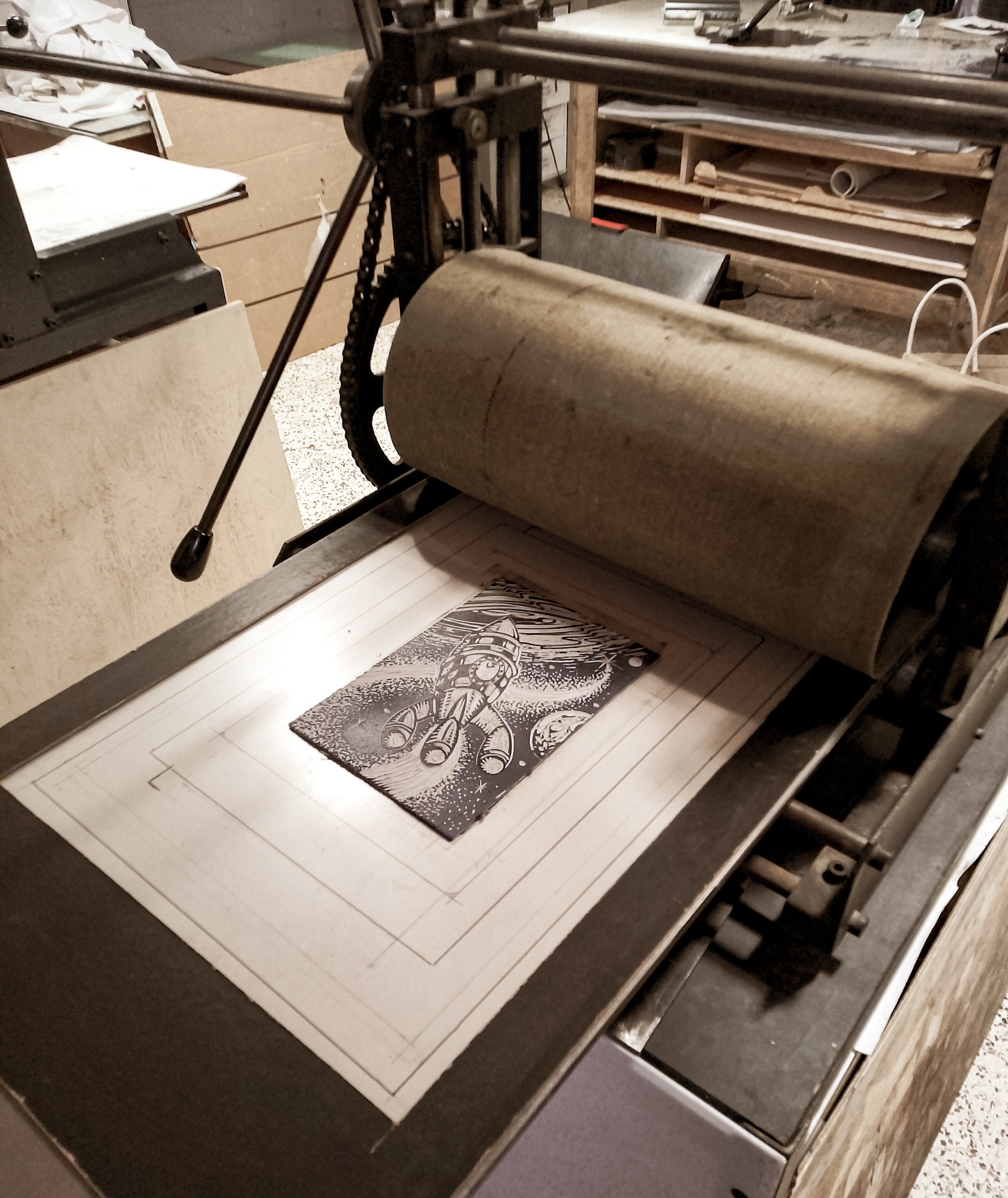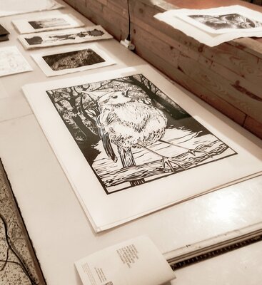 la mise à disposition des outils pour une initiation à la linogravure et à la taille-douce avec la chimie. Les eaux-fortes sont mordues au sulfate de cuivre.